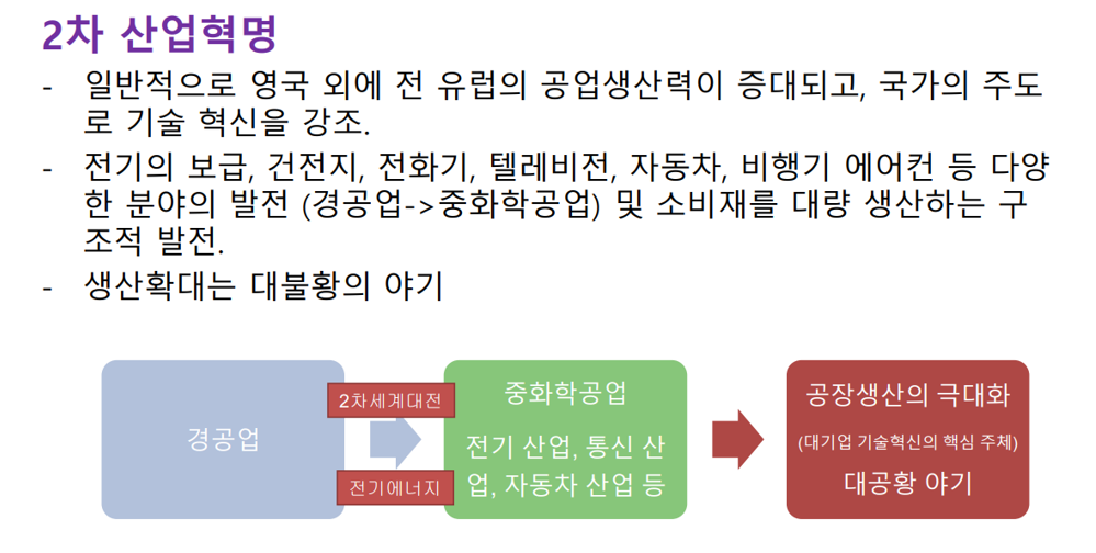 즉, 2차 산업혁명은 전기에너지와 중화학공업, 국가 주도 산업화를 통해, 인간의 삶을 더욱 빠르고 효율적으로 만든 변화의 시대라 할 수 있다. 이러한 변화는 곧 현대 자본주의 체제의 토대가 되었으며, 지금 우리가 사용하는 대부분의 전기 기반 기술은 이 시기에 뿌리를 두고 있다.