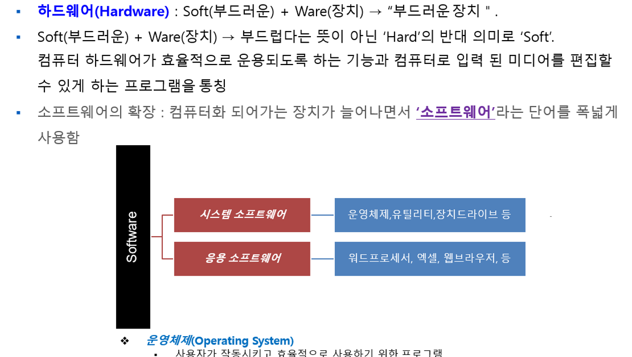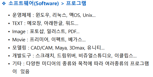 그리고, 이러한 하드웨어를 구동하는 명령 체계의 집합을 소프트웨어(Software)라고 하며, 소프트웨어는 크게 다음과 같이 분류된다.