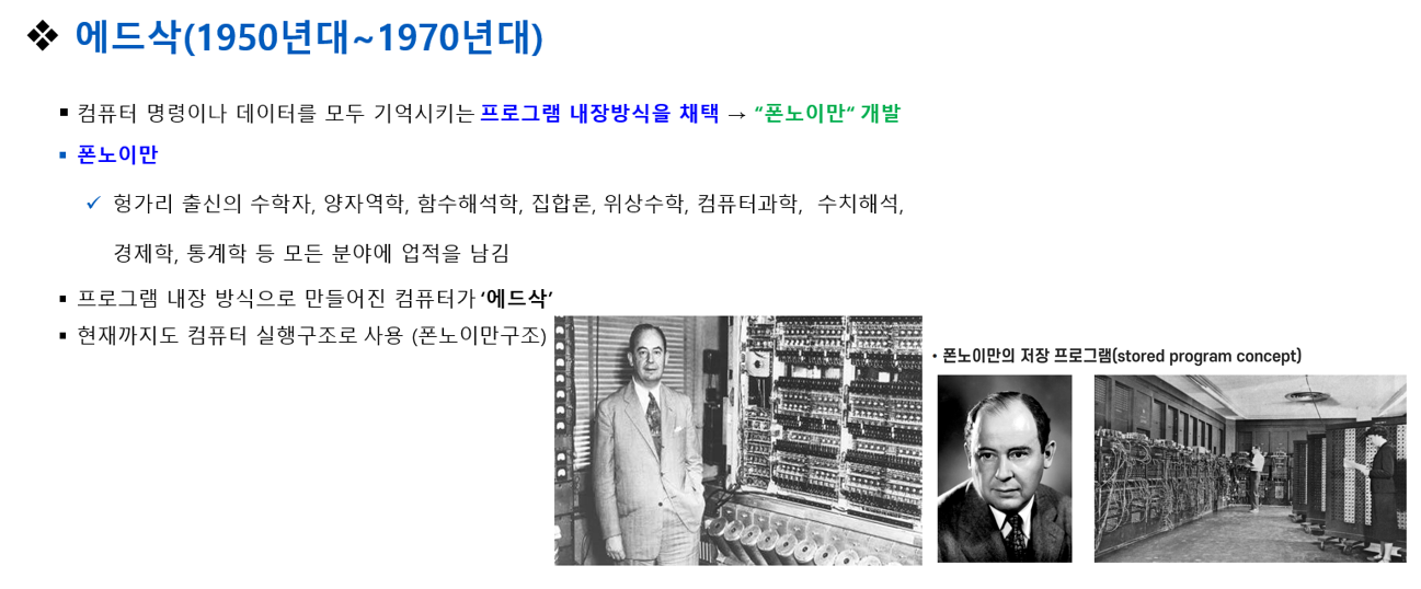 헝가리 출신의 수학자로서 양자역학, 함수해석학, 컴퓨터 과학, 통계학 등 다양한 분야에서 혁신적인 업적을 남긴 당대 최고의 천재 폰 노이만(John von Neumann)은, 컴퓨터의 명령어와 데이터를 모두 기억하는 내장 방식(stored-program concept)을 제안하였다.