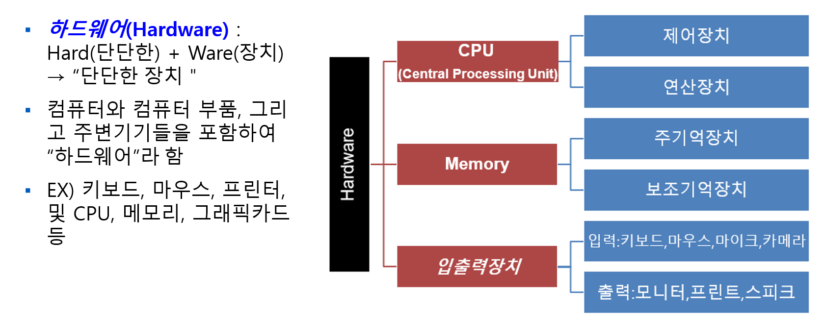 즉, CPU(중앙처리장치), 메모리(저장장치), 입출력 장치는 컴퓨터 하드웨어의 3대 요소로 불린다.