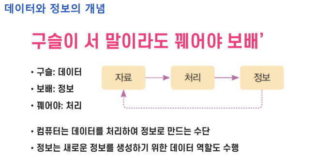 구슬이 서말이라도 꿰메야 보석인 것처럼 구슬 자체는 의미없는 값이 데이터가 되는 것이고 이것을 꿰메어 가치있게 만들어 보석이 된 것을 우리는 정보라고 하죠.
