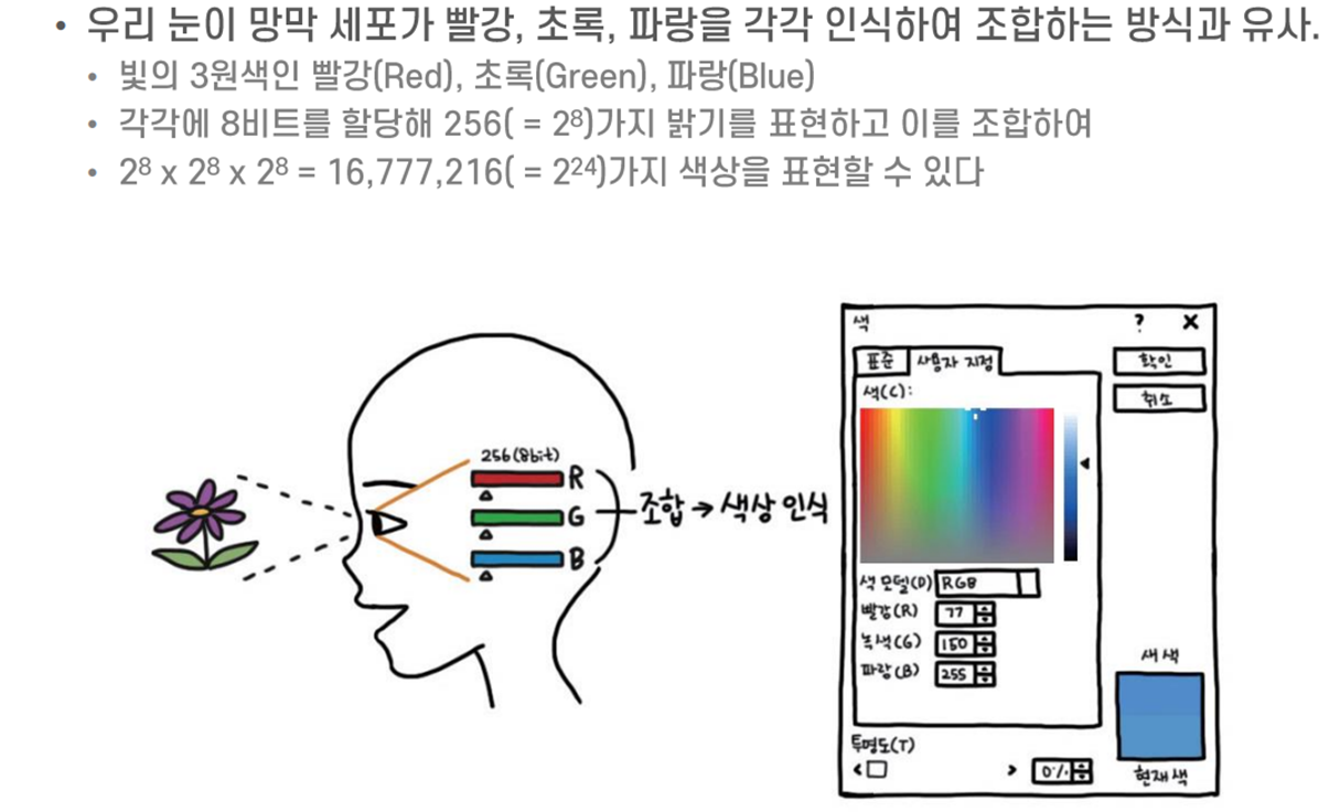 - 24비트 이미지 → 16,777,216개의 색상 표현 (RGB 컬러)