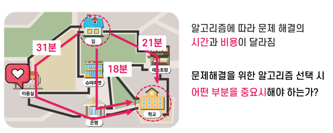 예를 들어, 현재 집에서 학교까지 가는 길은 지도상 슈퍼마켓을 경유하는 18분 거리의 경로가 최단 경로일 수 있다. 그러나 실제로 우리는 다양한 내·외부 요인, 편견, 편향 등에 영향을 받아 의사결정을 하게 된다. 얼핏 보면 인간은 매우 지능적으로 의사결정을 하는 것처럼 보이지만, 실상은 그렇게 효율적이지 않은 경우도 많다. 이러한 비효율성을 극복하고 문제를 더 체계적이고 효과적으로 해결하기 위한 방법이 바로 알고리즘 개발의 핵심이라 할 수 있다.