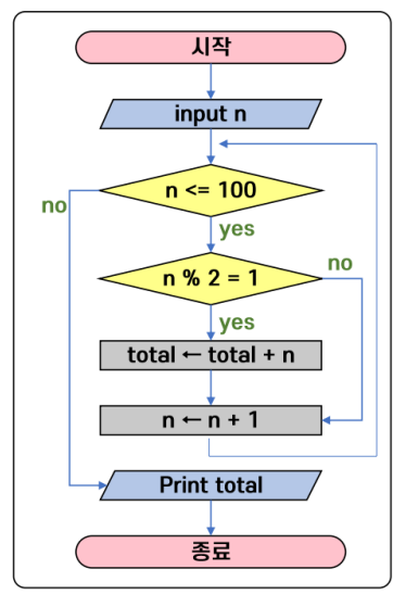 - 설명: 반복 구조는 특정 조건이 만족되는 동안 같은 작업을 반복하는 구조이다. "while" 또는 "for" 루프가 이러한 구조를 나타낸다.