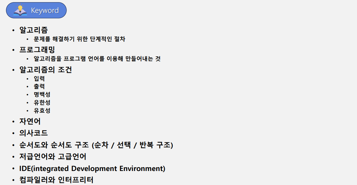 • 프로그램 : 컴퓨터로 문제를 해결하기 위해 작성하는 명령어들의 모임