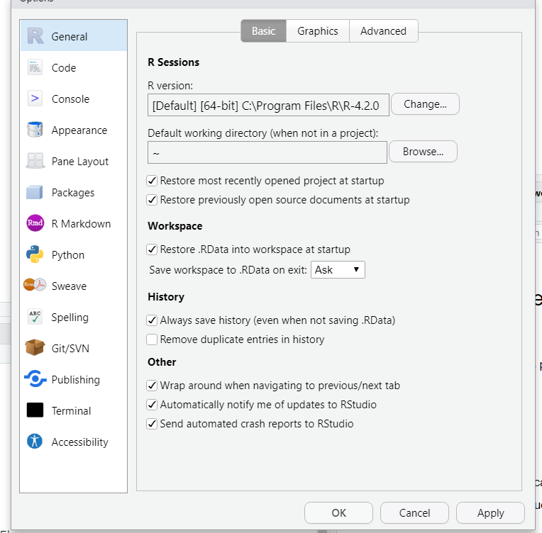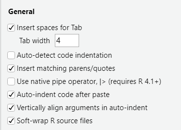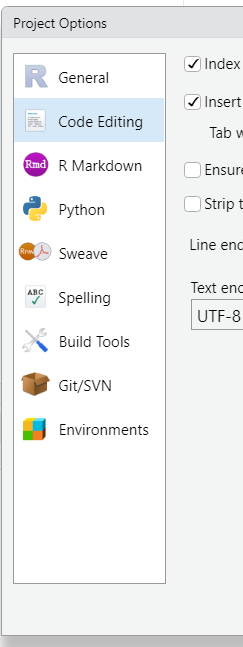 | Global Options | R sudio 전반에 영향을 미치는 옵션 |