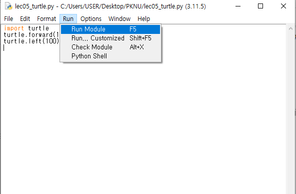 - 코드 실행 : F5 키를 누르거나 Run → Run Module을 선택.