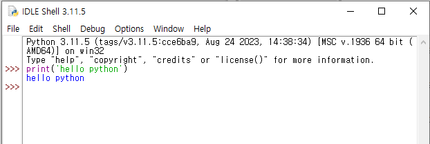 - 대화형 셸 (Interactive Shell): 사용자가 명령어를 입력하면 즉시 결과를 확인할 수 있는 인터페이스이다. >>> 프롬프트에 코드를 입력하고 실행하면 결과가 즉시 화면에 출력된다.