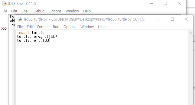 - 터틀 라이브러리를 import 해서 forward(100)을 실행 해 보자. 명령어가 즉각적인 결과를 만들어낸다는 점을 확인 할 수 있다.