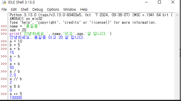 •학습목표 : 변수와 연산자의 개념을 이해하고 파이썬 IDLE에서 계산 해 본다.