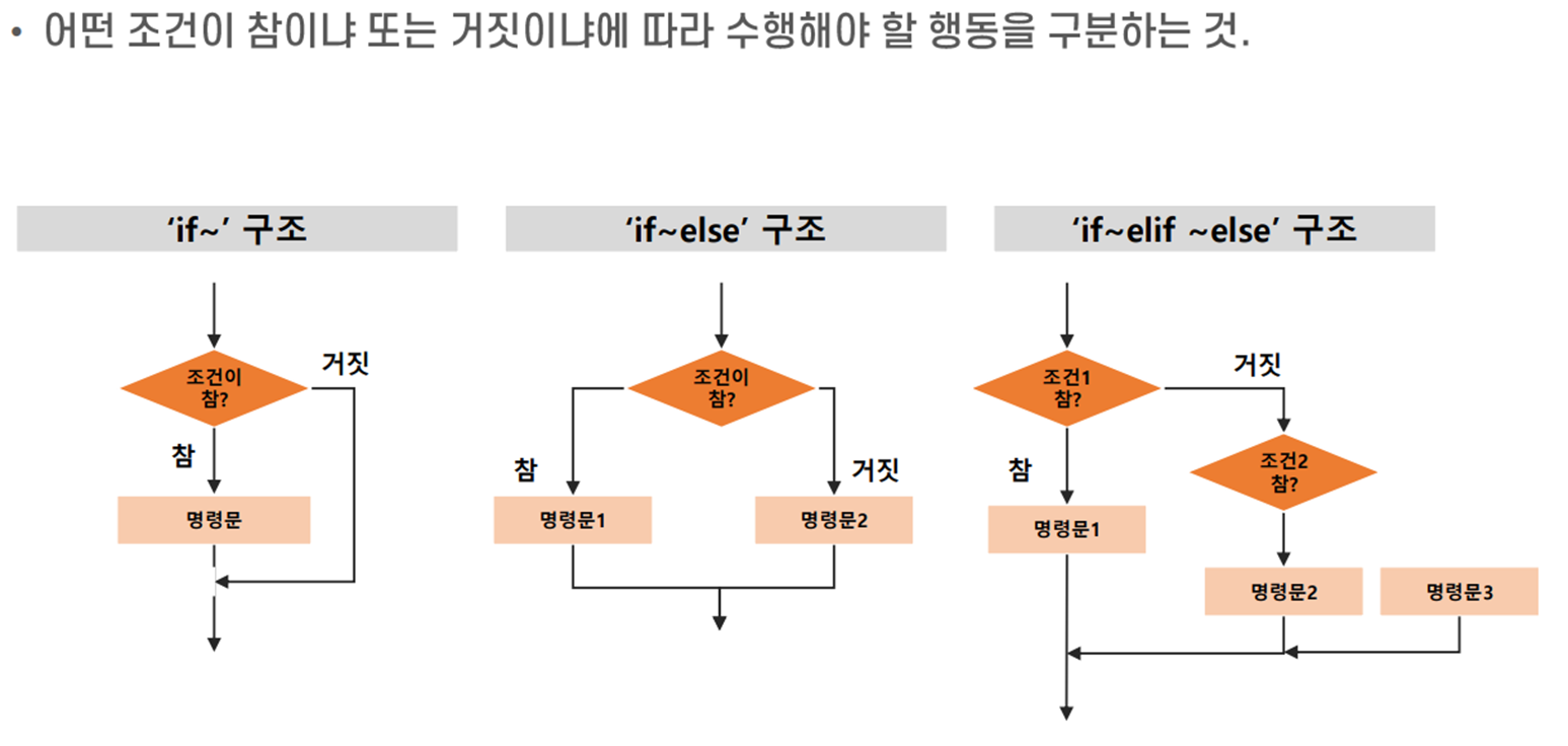 - 조건이 참인지 거짓인지에 따라 프로그램 흐름이 달라짐
