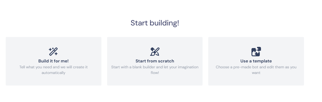 - 챗봇의 목적에 맞는 템플릿을 선택하거나, "Start from scratch" 옵션을 선택하여 처음부터 자신만의 챗봇을 설계할 수 있습니다.