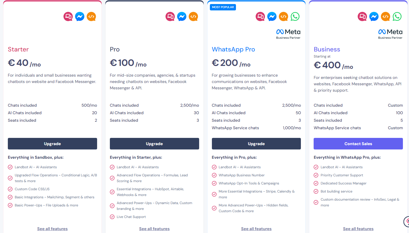 Landbot은 사용자와 대화식으로 상호작용할 수 있는 챗봇을 만들 수 있게 도와주는 플랫폼이다. 웹사이트, 모바일 앱, 또는 소셜 미디어 플랫폼에 통합할 수 있는 인터페이스를 제공한다. 이 툴은 특히 사용자 친화적인 드래그 앤 드롭 인터페이스를 통해 복잡한 코딩 없이도 챗봇을 설계하고 배포할 수 있다. 사용자는 미리 정의된 템플릿을 사용하거나 처음부터 새로운 대화 플로우를 생성할 수 있다.