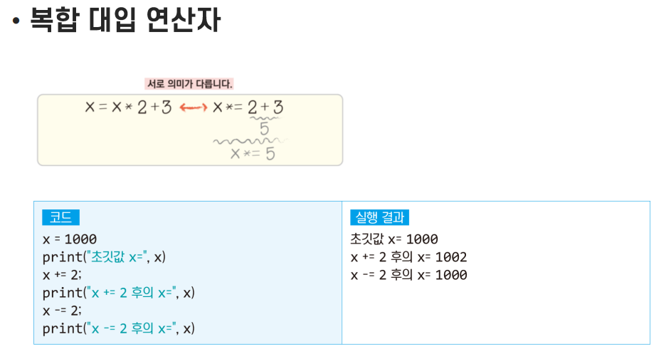 - = (할당), += (더하며 할당), -=, =, /=, //=, %=, *=
