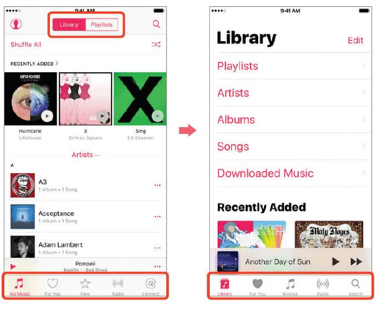 | iOS 앱은 화면 상단에 탐색 바를 배치하여 사용자가 앱의 현재 위치를 파악하고 탐색할 수 있게 한다. 또한 탭 바를 사용하여 주요 기능에 빠르게 접근하도록 돕는다. | 사용자가 앱을 실행하면 홈 화면이나 콘텐츠가 강조된 최상위 뷰를 먼저 보게 되며, 필요한 경우 카테고리 뷰를 통해 세부 뷰로 이동할 수 있다. |