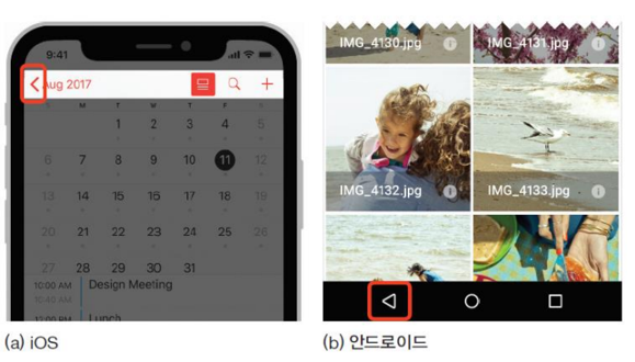 | iOS는 계층적이고 일관된 방식으로 설계되어 있으며, 주로 Bars, Views, Controls로 구성된다. | 안드로이드는 계층적 화면 구성을 통해 유연한 구조를 제공하며, 주로 최상위 뷰, 카테고리 뷰, 세부 뷰로 구분된다. |
