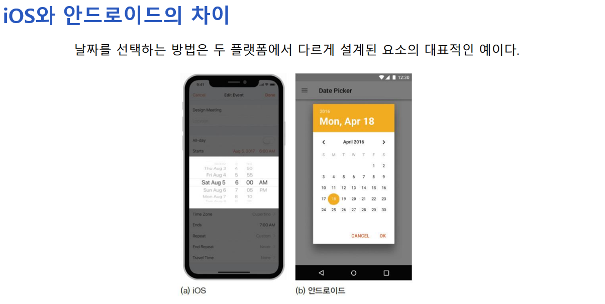 - 안드로이드 (오른쪽): 안드로이드의 날짜 선택기는 캘린더 스타일로 되어 있어 한 번에 더 많은 날짜를 볼 수 있도록 한다. 사용자는 원하는 날짜를 탭하여 선택하며, 더 큰 화면에서의 사용이 용이하다. 또한, 연도와 월을 쉽게 전환할 수 있는 드롭다운 메뉴가 포함되어 있어 캘린더 탐색이 더 직관적이다. 이는 안드로이드가 사용자에게 더 많은 시각적 정보와 선택 옵션을 제공하는 데 중점을 두는 특징을 보여준다.