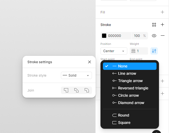 - 오른쪽 사이드바의 Stroke 섹션 에서 모양을 변경할 수 있습니다 . 여기에는 색상, 위치, 굵기, 스타일, 끝점 팁 또는 캡이 포함됩니다.