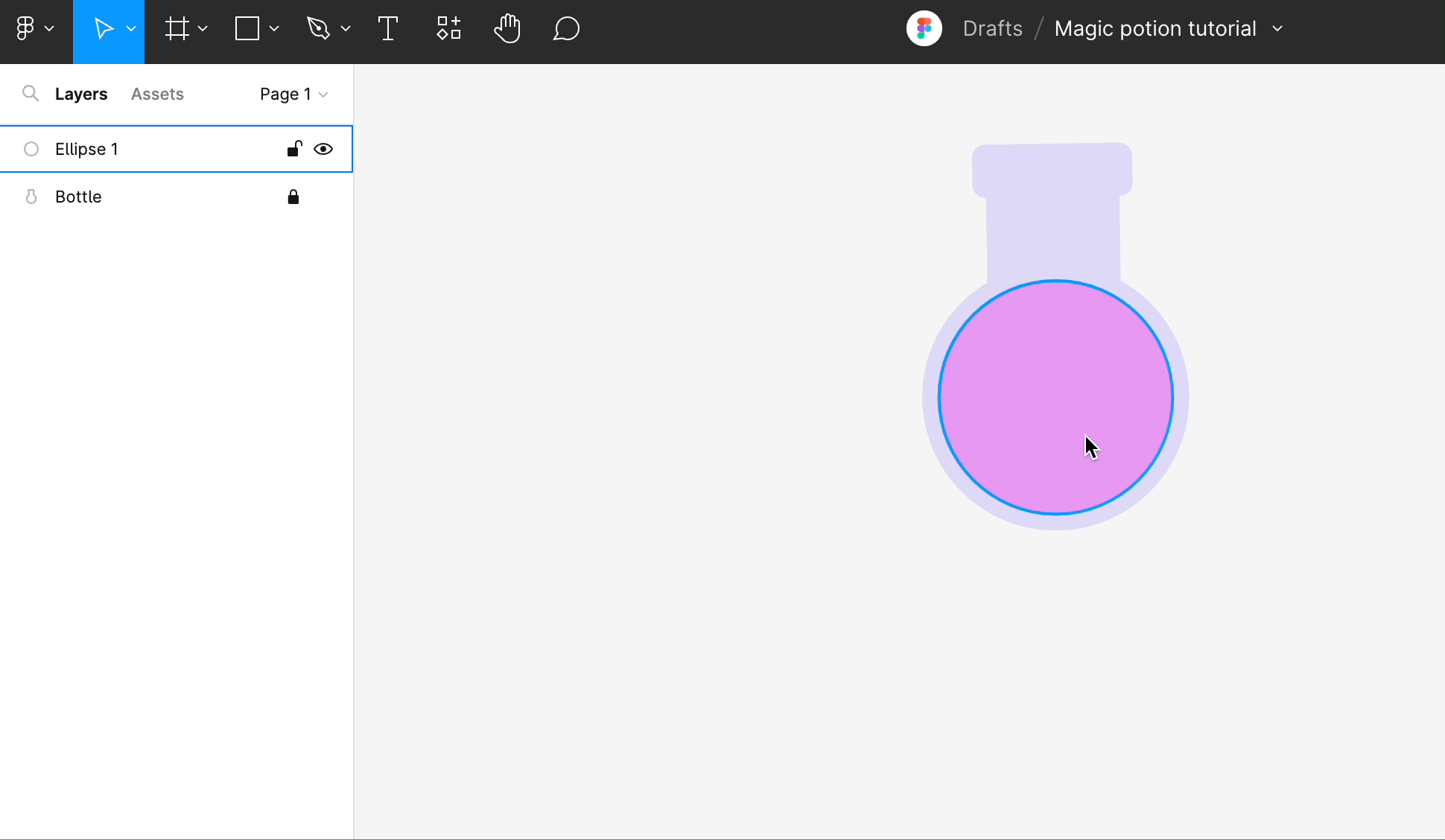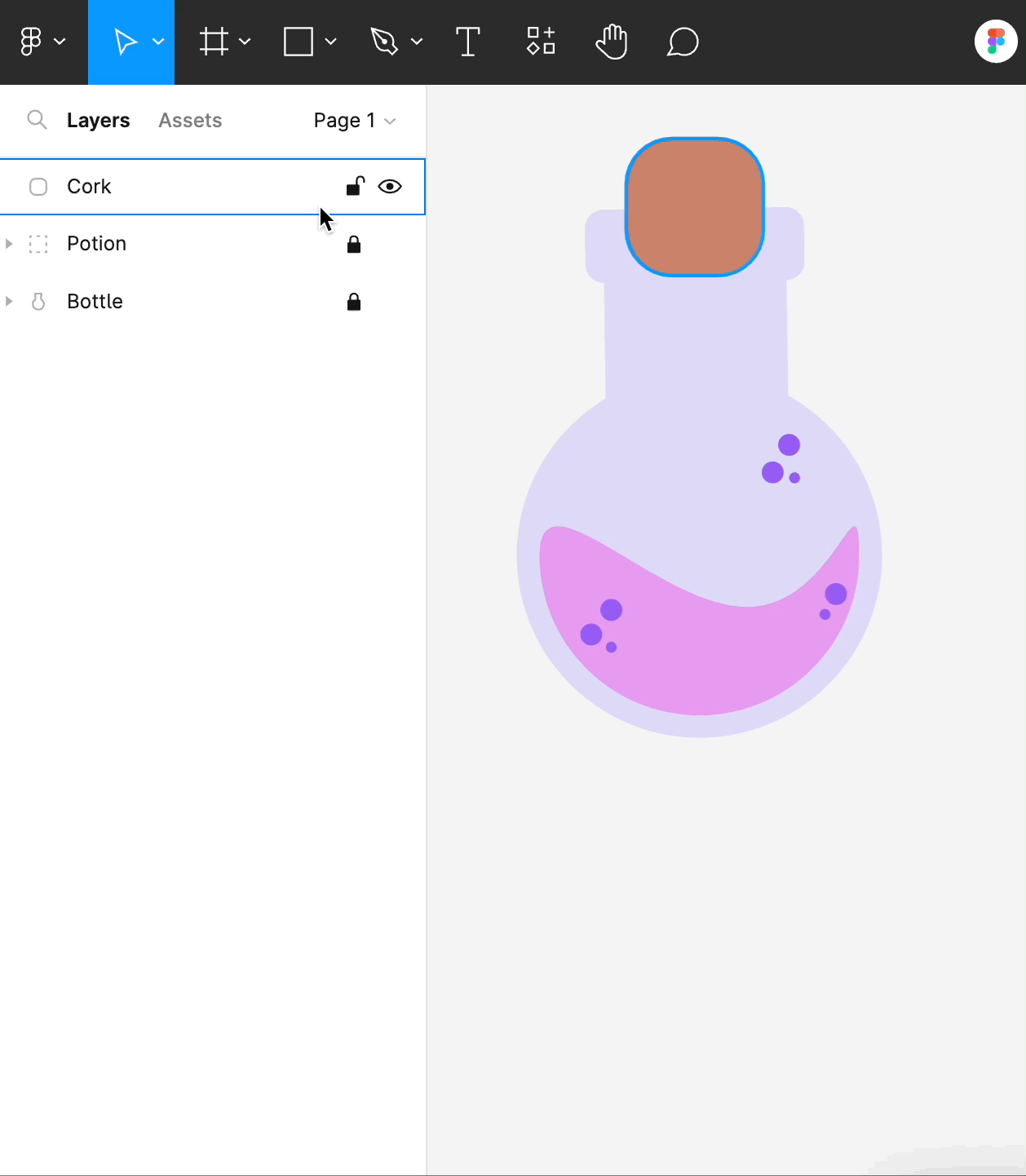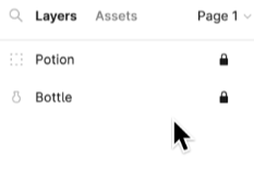 - 왼쪽 사이드바의 레이어 패널에 "Group 1"이라는 하나의 레이어만 표시되는 것을 알 수 있습니다. 레이어 이름 지정은 Figma에서 정리된 상태를 유지하는 또 다른 좋은 방법입니다. 레이어를 두 번 클릭하고 이름을 "Bottle"으로 바꿉니다.