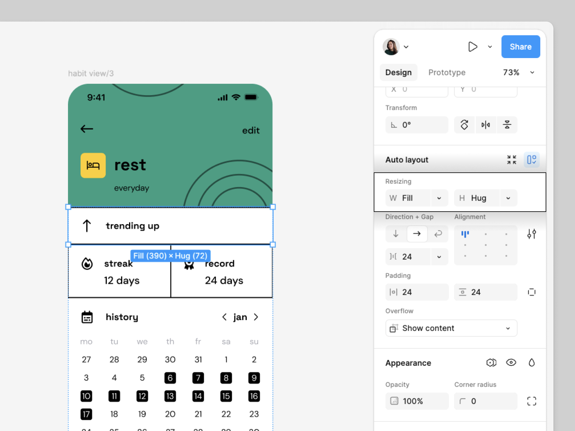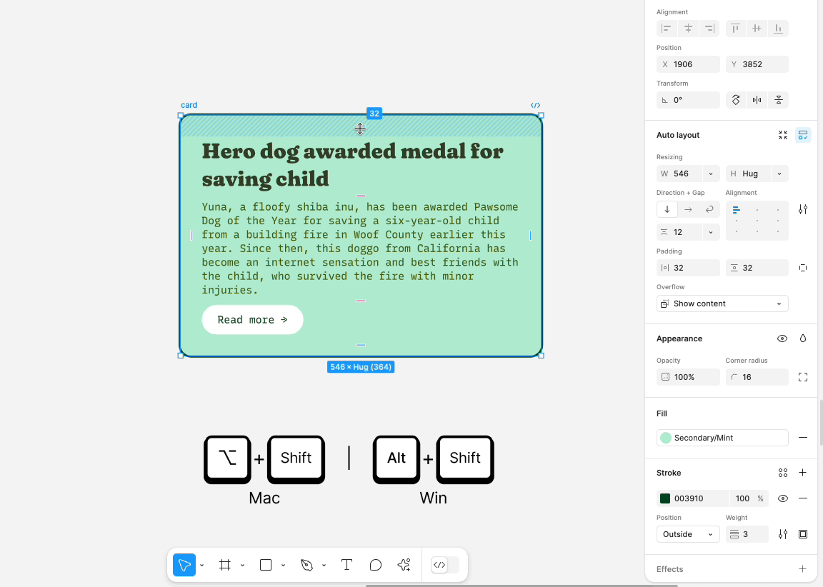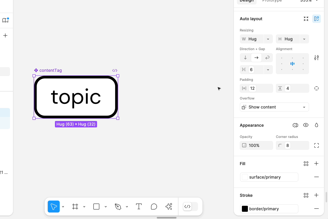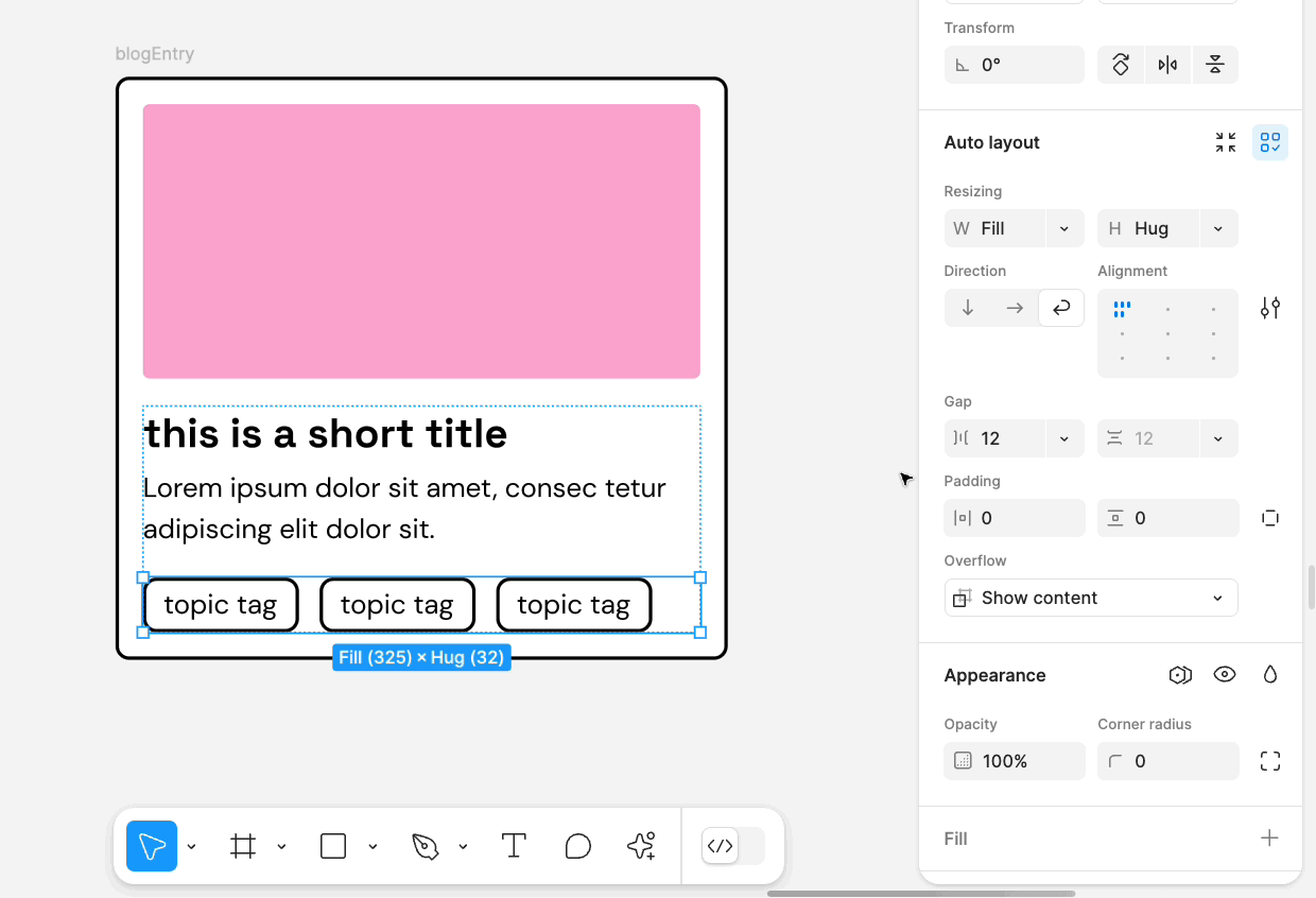 부모 자동 레이아웃 프레임의 크기 조정 동작을 설정하여 자식 개체에 대한 변경 사항에 맞게 조정합니다. 크기 조정 설정은 오른쪽 패널의 드롭다운 메뉴를 사용하여 X축과 Y축의 개체에 개별적으로 적용할 수 있습니다.