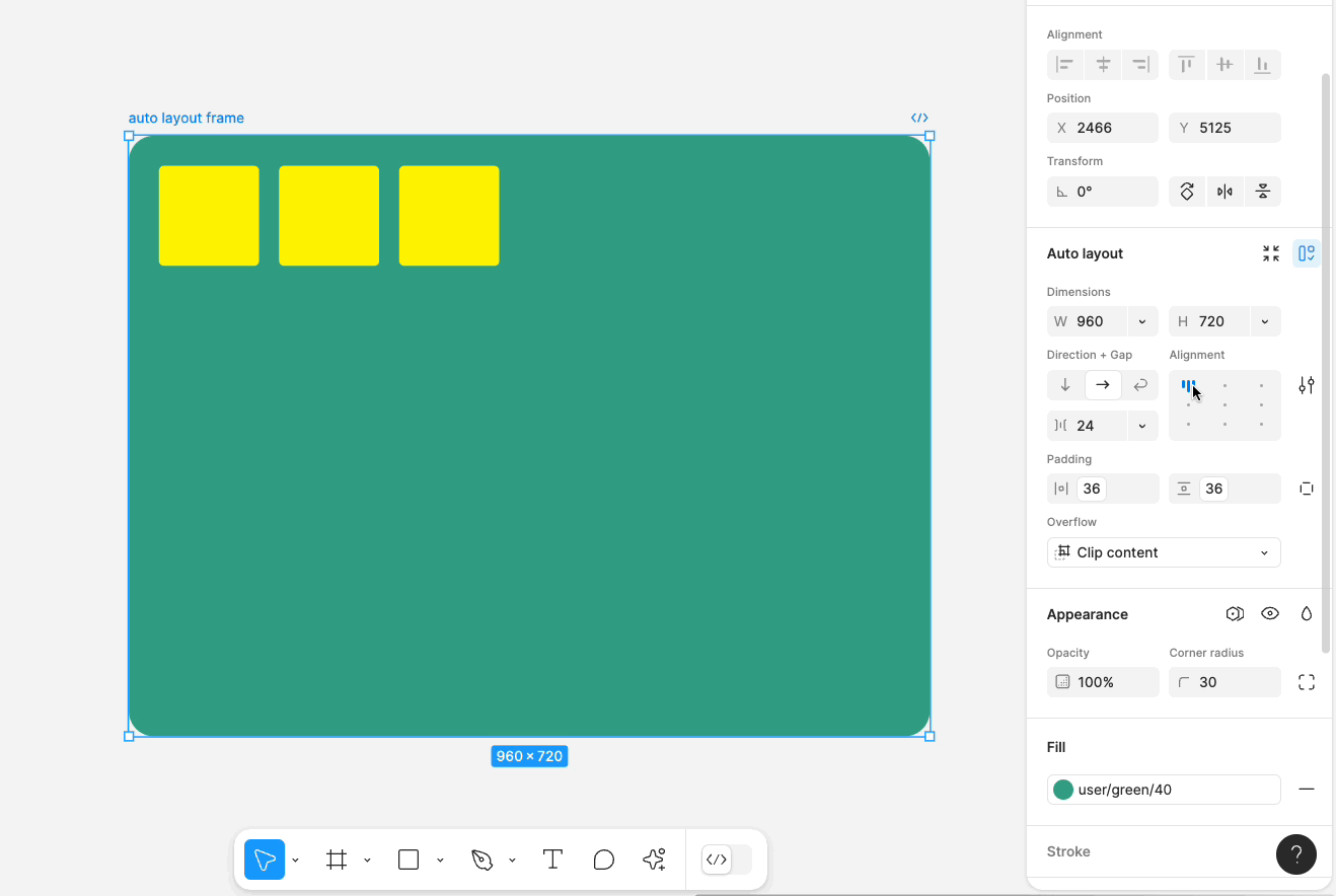 일반 프레임의 개체와 달리 개체의 정렬을 개별적으로 제어할 수 없습니다. 이러한 이유로 부모 자동 레이아웃 프레임에서 자식 개체의 맞춤을 설정합니다.