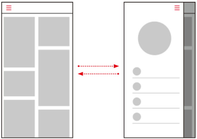 - 기본적으로 숨겨져 있어 화면 공간을 절약한다. 메뉴가 펼쳐졌을 때 이전 화면을 어둡게 오버레이하고 다시 메인 기능으로 돌아와 집중하도록 유도