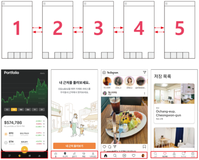 - 구조: 화면 하단에 여러 개의 탭이 배치되어 있으며, 각 탭을 클릭하면 서로 다른 페이지로 전환된다.