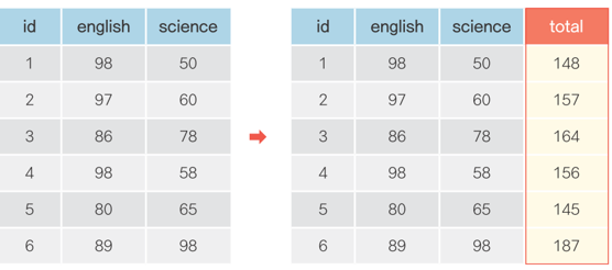 + mutate(total = math + english + science,