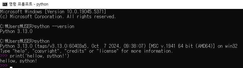터미널 또는 명령 프롬프트에서 python 명령어를 입력한다.