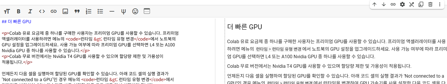 줄여서 'Colab'이라고도 하는 Colaboratory는 Google 리서치팀에서 개발한 제품입니다. Colab을 사용하면 누구나 브라우저를 통해 임의의 Python 코드를 작성하고 실행할 수 있습니다. Colab은 특히 머신러닝, 데이터 분석, 교육에 적합합니다. 더 기술적으로 설명하면 Colab은 호스팅된 Jupyter 노트북 서비스로, 설정하지 않고 사용 가능하며 GPU를 포함한 컴퓨팅 리소스를 무료로 사용할 수 있습니다.