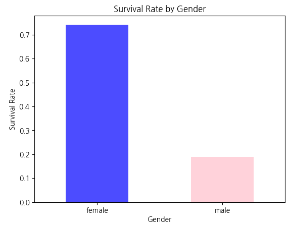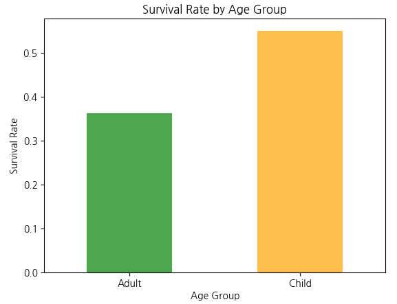 - 성별 생존률을 막대그래프로 표현하면 여성 생존률이 훨씬 높다는 패턴을 명확히 확인할 수 있다.