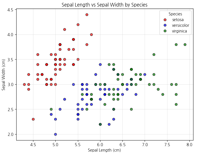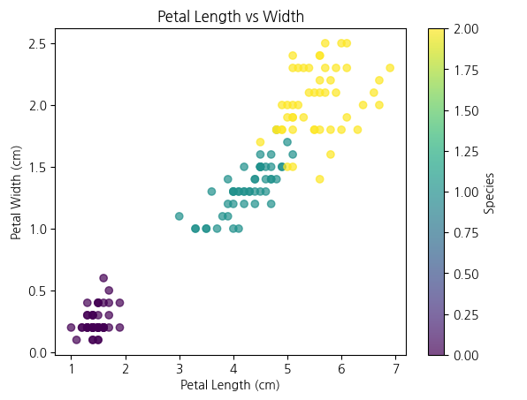 - Iris 데이터셋: 산점도를 통해 꽃잎(Petal) 길이와 너비의 관계를 보면, 특정 꽃의 종류를 분류할 수 있는 규칙이 보인다.