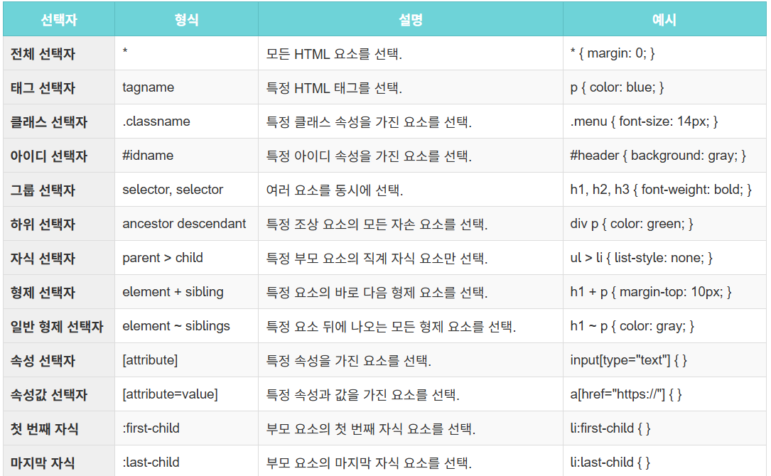 다음은 CSS 선택자의 종류를 테이블로 정리한 것이다: