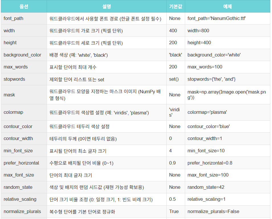 - WordCloud 주요 기능: