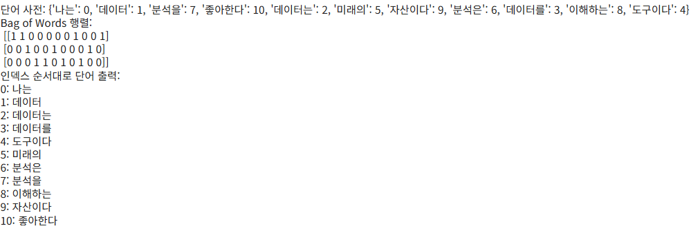 print("Bag of Words 행렬:\n", bow_matrix.toarray())