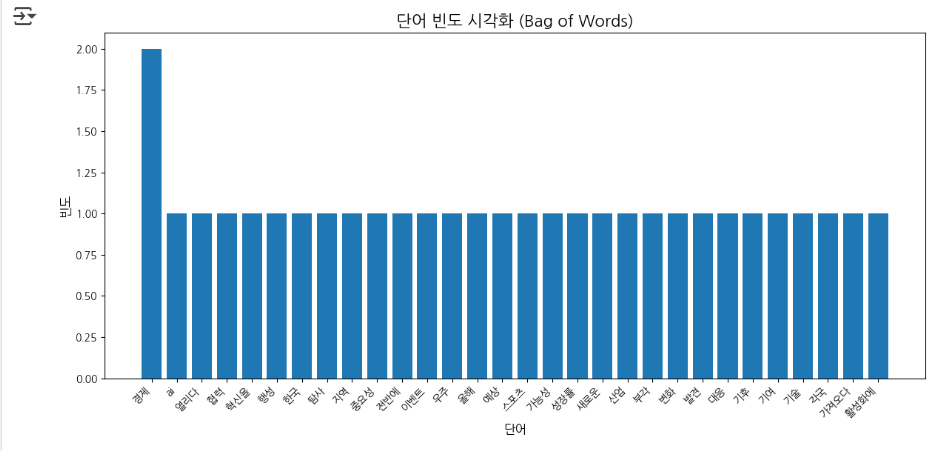 예: {'한국': 12, '경제': 3, '올해': 10, '성장률': 8, '예상': 11, ...} - Bag of Words 행렬: 각 문장(문서)을 행으로, 단어를 열로 하여 단어의 빈도를 숫자로 나타낸다.