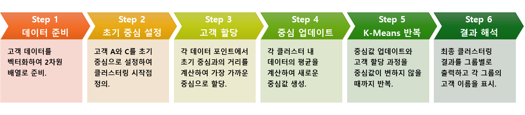 - 반복(Iteration): 중심값과 클러스터 할당을 업데이트하는 반복 과정.