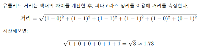 📌 즉, 유클리드 거리는 문장 간의 물리적 차이를 측정하는 방법으로, 값이 작을수록 문장이 비슷하다는 뜻이다.
