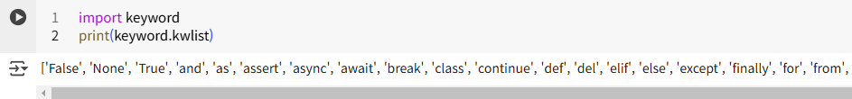 import keyword와 print(keyword.kwlist) 코드는 파이썬 내장 모듈인 keyword를 사용하여 파이썬의 키워드 리스트를 출력하는 코드입니다. 파이썬의 키워드는 언어에서 예약된 단어로, 변수명이나 함수명으로 사용할 수 없습니다.
