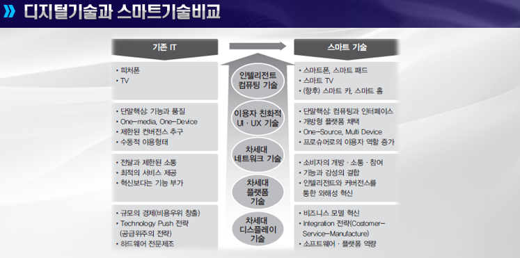 - 디지털 기술(기존 IT): 기능과 품질 중심, 제한된 서비스, 수동적 이용