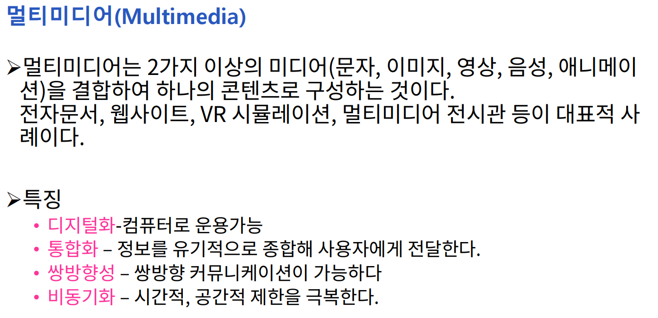 - 다매체성: 텍스트·이미지·영상·소리 등 복합적으로 결합
