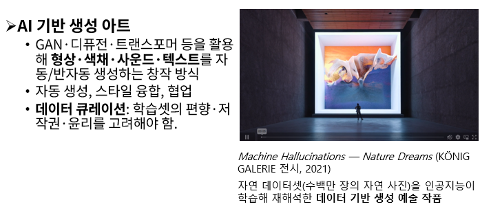 Refik Anadol 작품 사례로, 자연의 패턴과 색채를 AI가 변환하여 몰입형 비주얼 아트로 구현. 수백만 장의 자연 사진 데이터셋을 AI가 학습 → 재해석한 데이터 기반 생성 예술 작품