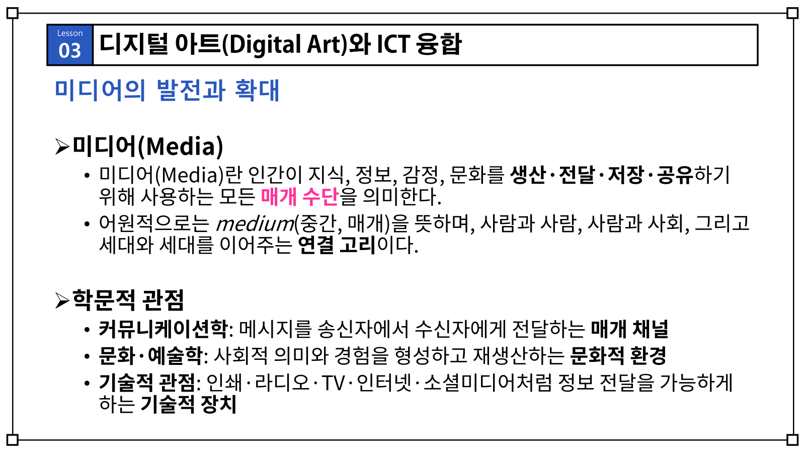 미디어는 단순히 정보를 전달하는 수단을 넘어, 사회적 의미를 만들고, 세대를 연결하고, 문화적 경험을 확장시키는 중요한 기반입니다. 앞으로 우리가 이야기할 디지털 아트는 바로 이 미디어의 진화와 ICT 기술 위에서 꽃피운 새로운 예술 형식이라고 할 수 있습니다.