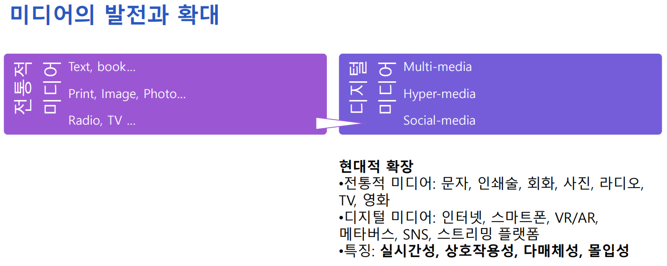 그러나 인터넷과 스마트폰이 등장하면서 디지털 미디어 시대가 열렸습니다. 이제는 텍스트, 이미지, 영상이 모두 디지털로 전송되고, VR·AR 같은 몰입형 미디어, 그리고 메타버스·SNS·스트리밍 플랫폼이 등장했습니다.