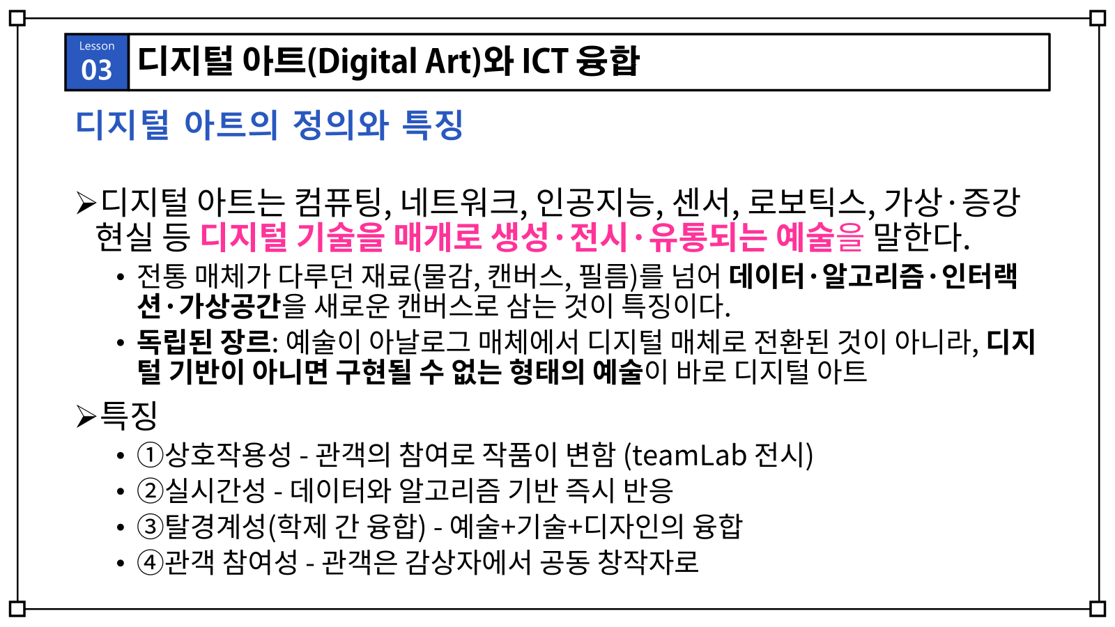 앞으로 여러분이 보게 될 다양한 디지털 아트 작품들은, 바로 이 네 가지 특징을 어떻게 구현하는가에 따라 그 가치와 의미가 달라질 것입니다.