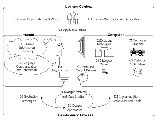 - 중앙: Human ↔ Computer (인간과 컴퓨터의 상호작용): 인간의 특성과 컴퓨터 시스템의 구성 요소가 상호작용하는 구조를 보여준다.