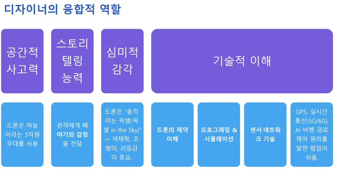결국 드론 예술은 예술적 감각과 기술적 지식이 동시에 요구되는 융합적 영역이다. 디자이너는 단순한 창작자가 아니라, 기술과 예술을 연결하는 매개자이자 협업자로서 중요한 역할을 담당한다.