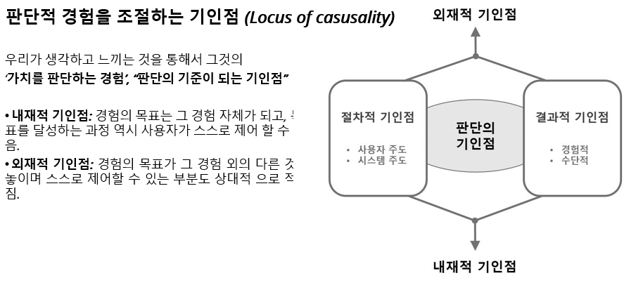 판단적 경험은 사용자가 경험을 어떤 관점에서 해석하고 조절하는가에 따라 내재적 기인점과 외재적 기인점으로 나뉜다.