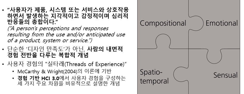“사용자가 제품, 시스템 또는 서비스와 상호작용하면서 발생하는 지각적·감정적·심리적 반응들의 총합”이다.