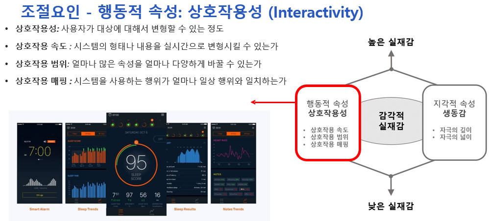- 상호작용 속도, 반응의 정확성, 상호작용 범위가 모두 높을수록 몰입과 실재감이 증대된다.